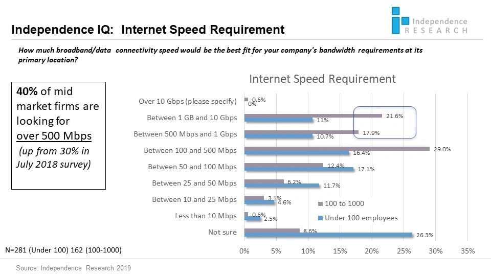 Smaller entities with less than 100 employees tend to have a sweet spot between 50 Mbps and 500 Mbps. All that has implications for the value of telco or internet service provider internet access for businesses.